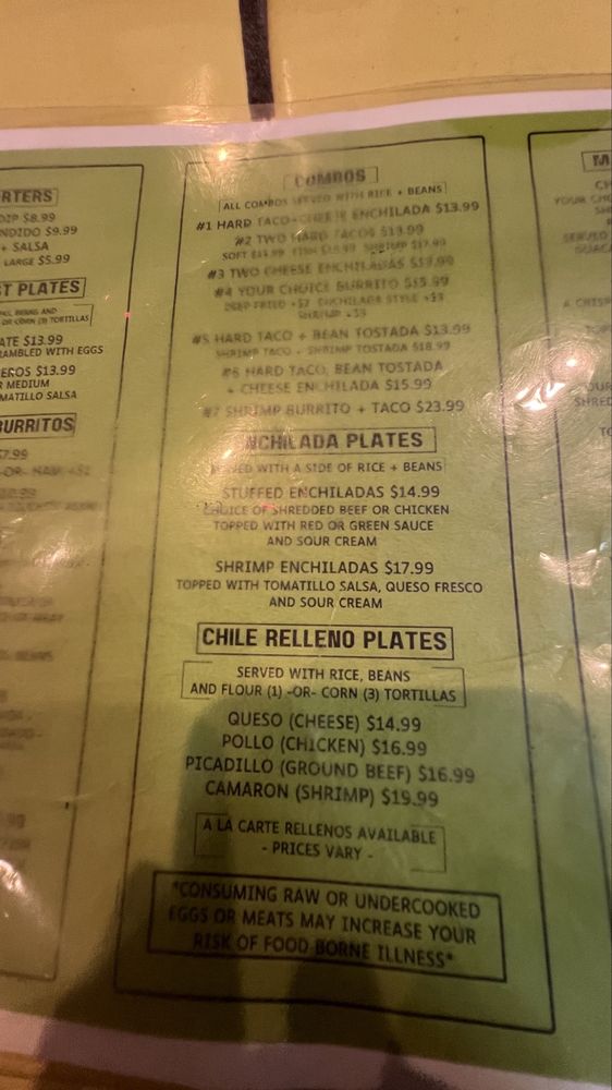 2 shrimp enchiladas smothered with fresh tomatillo sauce, queso fresco, topped with sour cream. Served with rice and beans, garnish.